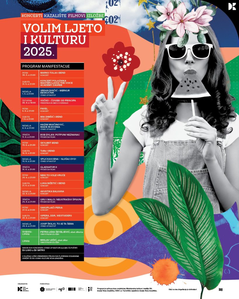 Dom kulture Nova Gradiška i ove godine, po sedmi put zaredom, s ponosom organizira manifestaciju Volim ljeto i kulturu, već prepoznatu kao nezaobilazni dio kulturnog ljeta u našem gradu. Program će se održavati od 30. svibnja do 29. lipnja u Gradskom parku, s početkom u 21:00 sat, osim dječje predstave koja počinje u 19:00 sati. U slučaju loših vremenskih prilika, sva planirana događanja održat će se u Domu kulture.
